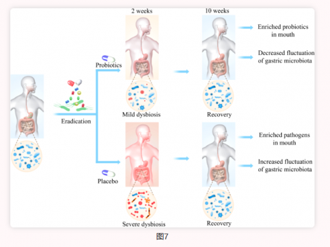 結(jié)果顯示: 思連康雙歧桿菌四聯(lián)活菌片組胃腸道不良反應(yīng)發(fā)生率低于安慰劑組(23.6% vs 37.7%,p =0.016)。除此之外,在根除后,腸道菌群結(jié)構(gòu)發(fā)生了劇烈的變化,變形菌門取代了共生厚壁菌門和擬桿菌門,并在兩周后逐漸恢復(fù)。補(bǔ)充思連康雙歧桿菌四聯(lián)活菌片可中和根除藥物所帶來的腸道擬桿菌門的減少,使胃菌群的波動更加平穩(wěn),抑制口腔致病菌的生長。 01思連康減少Hp根除后不良反應(yīng) 與安慰劑組相比,雙歧桿菌四聯(lián)活菌片組胃腸道不良反應(yīng)的總體發(fā)生率顯著降低(23.62% vs 37.7%,p =0.016),且安慰劑組惡心嘔吐發(fā)生率高于雙歧桿菌四聯(lián)活菌片組(24.59% vs 13.39% ,p =0.024)(圖1)。 02思連康緩解Hp根除后的腸道菌群紊亂 03思連康可使Hp根除后胃菌群波動減小 04思連康可抑制Hp根除后口腔致病菌生長 越來越多的證據(jù)提示,根除幽門螺桿菌感染的鉍劑四聯(lián)療法會導(dǎo)致腸道菌群穩(wěn)態(tài)的短期受損。《第六次全國幽門螺桿菌感染處理共識報(bào)告》明確指出,根除治療可改變腸道微生物種群的多樣性和結(jié)構(gòu)。 本次研究顯示: 頓服思連康雙歧桿菌四聯(lián)活菌片,可降低胃腸道不良反應(yīng)的發(fā)生率。 根除幽門螺桿菌后,唾液、胃和腸道的微生物菌群組成發(fā)生顯著變化,停用抗生素兩周后腸道菌群恢復(fù)到基線水平。通過頓服思連康雙歧桿菌四聯(lián)活菌片治療,可使微生物菌群的紊亂得到緩解(圖7)。這為幽門螺桿菌治療方案的進(jìn)一步優(yōu)化以及副作用的減輕提供了新的臨床應(yīng)用方向和思路。 [1] YUAN Z, XIAO S, LI S, et al. The impact of Helicobacter pylori infection, eradication therapy, and probiotics intervention on gastric microbiota in young adults [J]. Helicobacter, 2021, 26(6): e12848. [2] SALAMA N R, HARTUNG M L, MüLLER A. Life in the human stomach: persistence strategies of the bacterial pathogen Helicobacter pylori [J]. Nature reviews Microbiology, 2013, 11(6): 385-99. [3] BANG C S, LIM H, JEONG H M, et al. Amoxicillin or tetracycline in bismuth-containing quadruple therapy as first-line treatment for Helicobacter pylori infection [J]. Gut microbes, 2020, 11(5): 1314-23. [4] YE Q, SHAO X, SHEN R, et al. Changes in the human gut microbiota composition caused by Helicobacter pylori eradication therapy: A systematic review and meta-analysis [J]. Helicobacter, 2020, 25(4): e12713. [5] CHEN C C, LIOU J M, LEE Y C, et al. The interplay between Helicobacter pylori and gastrointestinal microbiota [J]. Gut microbes, 2021, 13(1): 1-22. [6] ZHAO Y, YANG Y, ARUNA, et al. Saccharomyces boulardii Combined With Quadruple Therapy for Helicobacter pylori Eradication Decreased the Duration and Severity of Diarrhea: A Multi-Center Prospective Randomized Controlled Trial [J]. Frontiers in medicine, 2021, 8: 776955. [7] PLOMER M, III PEREZ M, GREIFENBERG D M. Effect of Bacillus clausii Capsules in Reducing Adverse Effects Associated with Helicobacter pylori Eradication Therapy: A Randomized, Double-Blind, Controlled Trial [J]. Infectious diseases and therapy, 2020, 9(4): 867-78. [8] YANG C, LIANG L, LV P, et al. Effects of non-viable Lactobacillus reuteri combining with 14-day standard triple therapy on Helicobacter pylori eradication: A randomized double-blind placebo-controlled trial [J]. Helicobacter, 2021, 26(6): e12856. [9]《第六次全國幽門螺桿菌感染處理共識報(bào)告》
