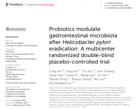 南昌大學(xué)第一附屬醫(yī)院呂農(nóng)華教授牽頭,包括西安市中心醫(yī)院、山西醫(yī)科大學(xué)第一附屬醫(yī)院、鄭州大學(xué)第五附屬醫(yī)院、云南省第一人民醫(yī)院、南京醫(yī)科大學(xué)附屬南京醫(yī)院及浙江中醫(yī)藥大學(xué)第一附屬醫(yī)院在內(nèi)的全國七家三甲醫(yī)院共同開展了一項(xiàng)為期兩年八個月的多中心、隨機(jī)、雙盲、安慰劑對照研究,并在2022年11月Frontiers in Immunology(IF:8.786)發(fā)表了題為”Probiotics modulate gastrintestinal microbiota after Helicobacter pylori eradication:A multicenter randomized double-blind placebo-controlled trial”的研究論文。旨在進(jìn)一步明確思連康雙歧桿菌四聯(lián)活菌片聯(lián)合14天含鉍劑四聯(lián)療法根除幽門螺桿菌的療效和安全性,以及對胃腸道菌群變化的影響。